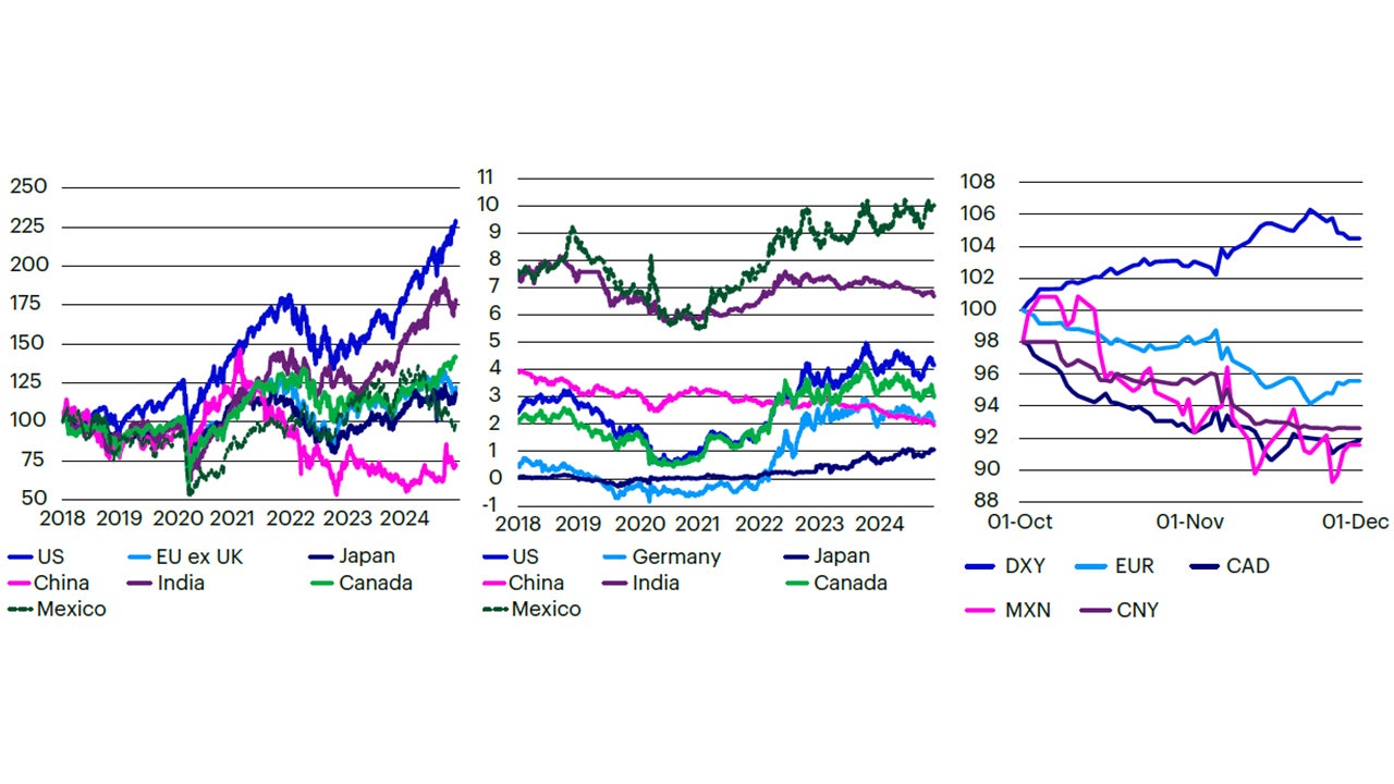 Note: Left, MSCI in USD terms as currency movements reflect shifts in the terms of trade driven by changes in tariffs. Middle, 10-year government bond yields; in the absence of a benchmark common bond for the EU (ex UK); German Bunds as a proxy. Right, index of bilateral currency crosses against the USD, 01 October 2024 = 100; currencies whose quoting convention has a higher number for a weaker currency are shown with index values reversed. Source: Bloomberg, Macrobond, Invesco. Right daily 01 Oct to 01 Dec 2024; rest, daily data from 01 Jan 2018, as at 6 Dec 2024.