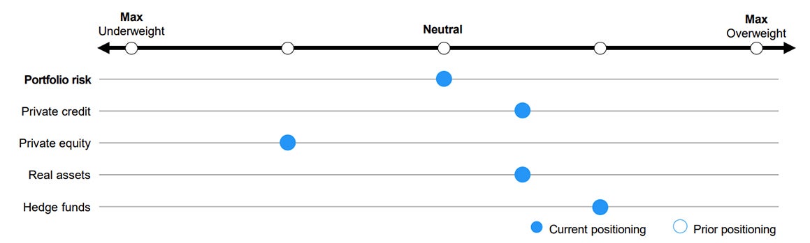 Private credit: We are still overweight direct lending as all-in yields remain attractive for senior positioning, especially in the core middle market. Significant private equity dry powder and a backlog of exits point to a continuation of recently improved deal activity. We are overweight real estate credit given high levels of current income and a recovering real estate equity market.