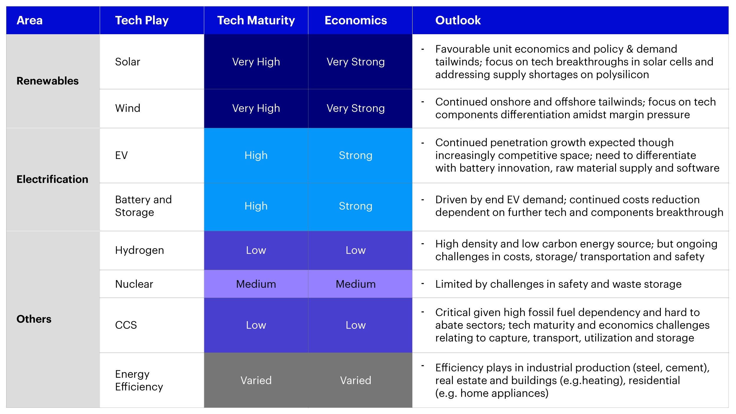 A pathway to decarbonization requires a variety of technologies especially given different requirements and constraints across different sectors. Correspondingly, the range of technologies are all at different stages of maturity; in more developed spaces the focus is on wider policy support and addressing supply chain bottlenecks like raw materials, transportation, storage, and infrastructure while spaces at earlier stages require greater technology breakthroughs. From an investment perspective, in addition to analyzing the technological maturity and unit economics outlook, the competitive dynamics and moats of differentiation within specific players would also be additional factors to consider. Looking ahead, investing in this space requires moving from a broad-stroke sector approach to identifying differentiated leaders across the value chain.