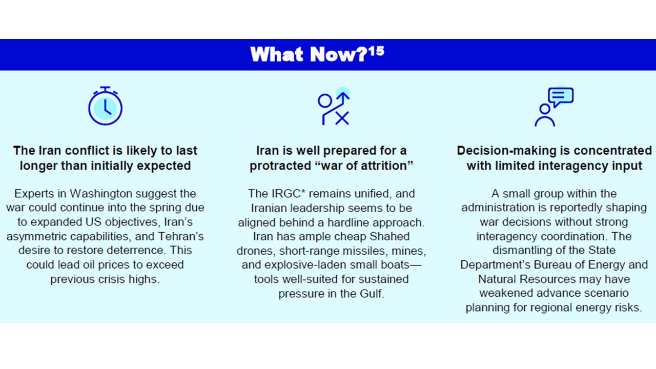 - Although the International Energy Agency (IEA) has announced 400 million barrels of coordinated release from strategic petroleum reserves (SPR)—with contributions signaled from Japan, South Korea, France, Germany, the UK, and the US—the actual impact may be limited. Withdrawals are constrained by how quickly crude can physically be draw down, with release rates likely capped at only a few mb/d. There are also limits on how much the US can release before challenging operational and congressional mandates. Rising threats to regional energy infrastructure and the possibility of additional supply shut-ins in a prolonged-conflict scenario will likely further erode the effectiveness of reserve releases.10