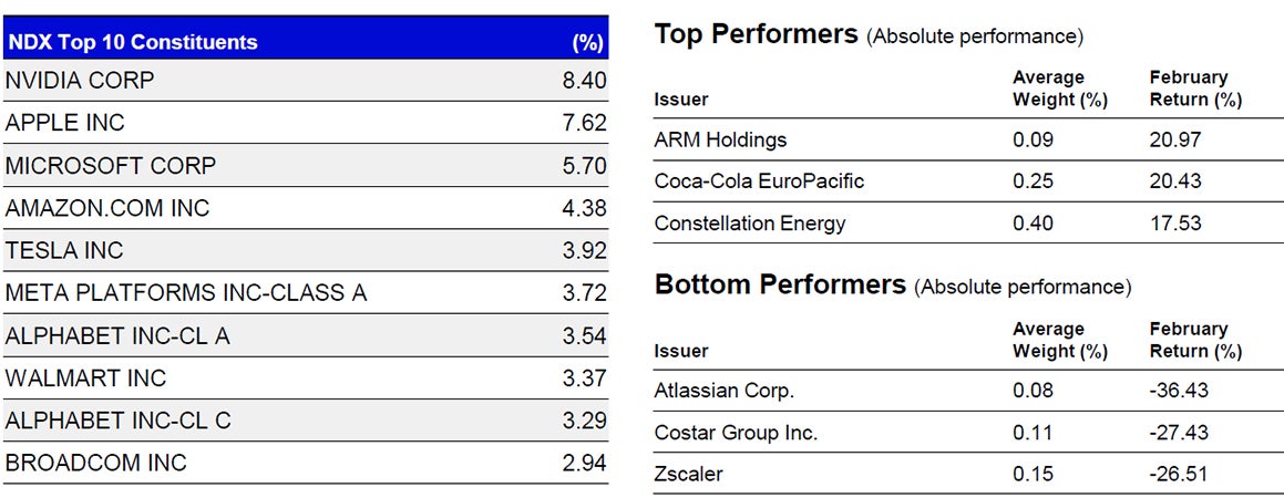 - NDX’s underperformance was driven by its overweight in the Technology sector along with its underweight position and differentiated holdings in the Industrials sector.