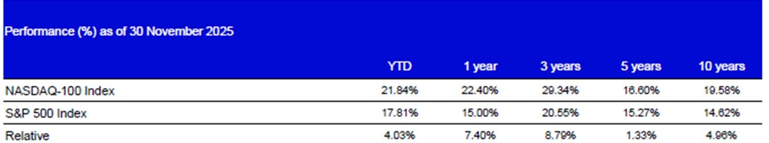 Data: Bloomberg, L.P., as of 30/11/2025. An investor cannot invest directly in an index. Past performance does not predict future results. All data is in USD unless indicated otherwise.