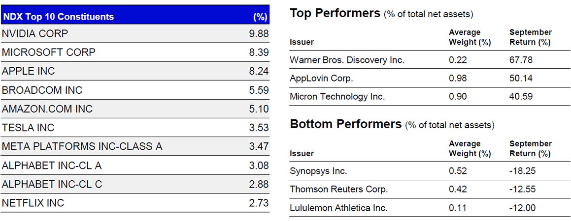 - In September, the NASDAQ-100 Index (NDX) returned 5.47% vs. 3.65% of the S&P 500.