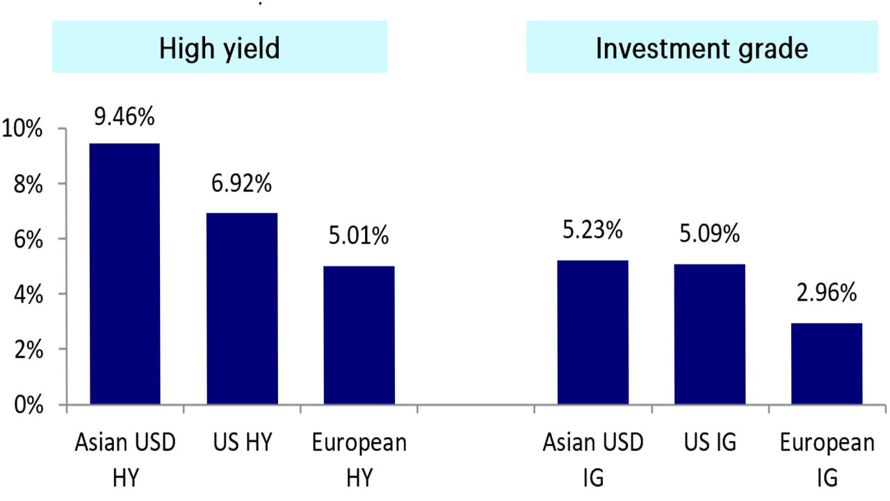 Source: Bloomberg, Invesco; data as of 28 February 2025. Asian USD high yield is represented by J.P. Morgan JACI Non-Investment Grade Yield-to-Maturity, US high yield by ICE BofA US High Yield Index, European high yield by ICE BofA Euro High Yield Index, Asian USD investment grade by J.P. Morgan JACI Investment Grade Yield-to-Maturity, US investment grade by ICE BofA US Corporate Index and European investment grade by ICE BofA Euro Corporate Senior Index.