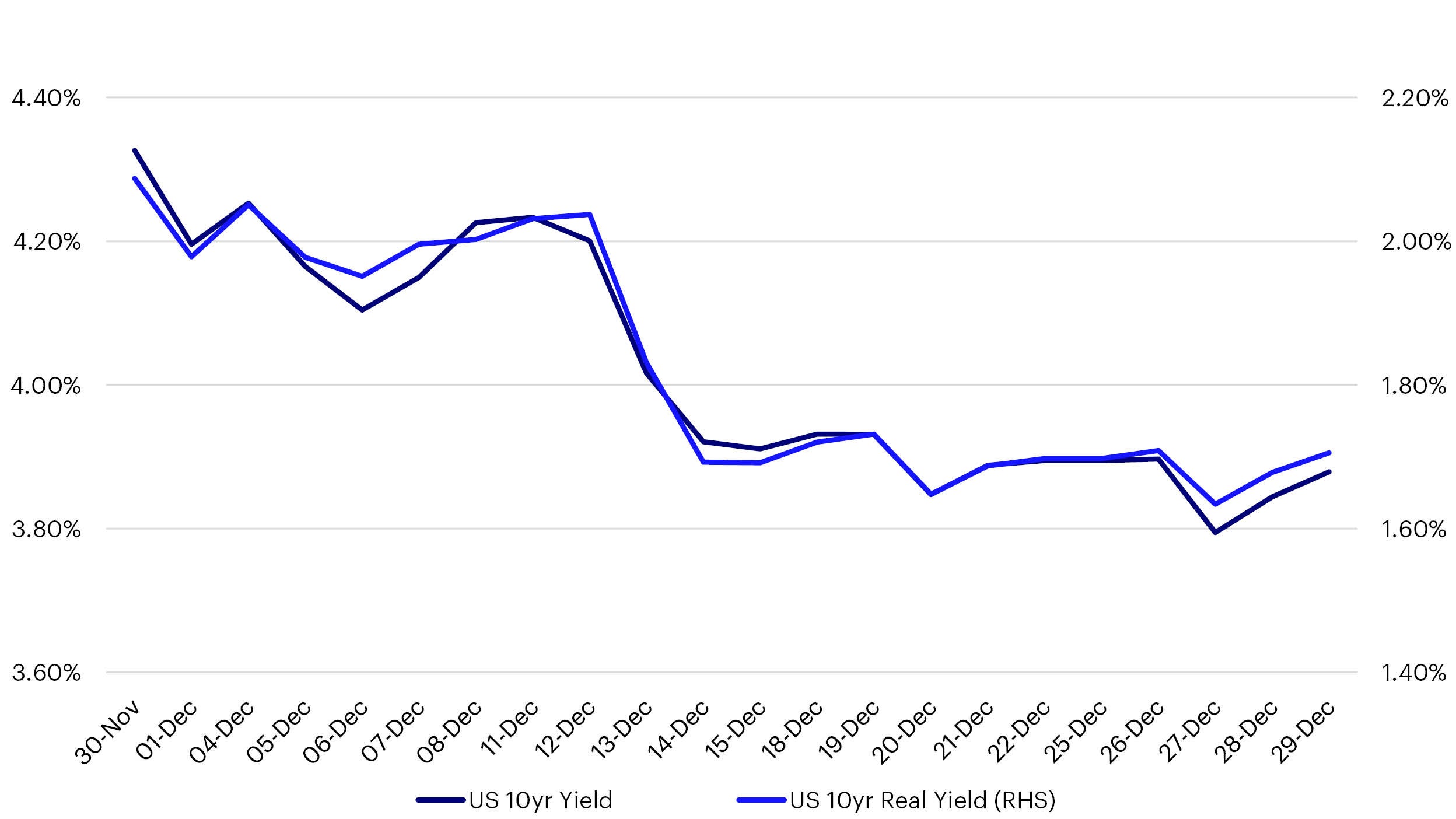 The gilt market also rallied in December, driven by a combination of the global backdrop, weaker domestic data and by UK inflation data falling more quickly than had been anticipated. The Bank of England held rates for the third consecutive meeting while, at 3.9%, CPI is now at the lowest levels for over two years which should continue to provide a supportive environment for UK bond markets. Nevertheless, it did mean while they had an incredibly strong month, real yields on index-linked gilts rallied by less that yields on the nominal counterparts as breakeven inflation rates narrowed over the month.