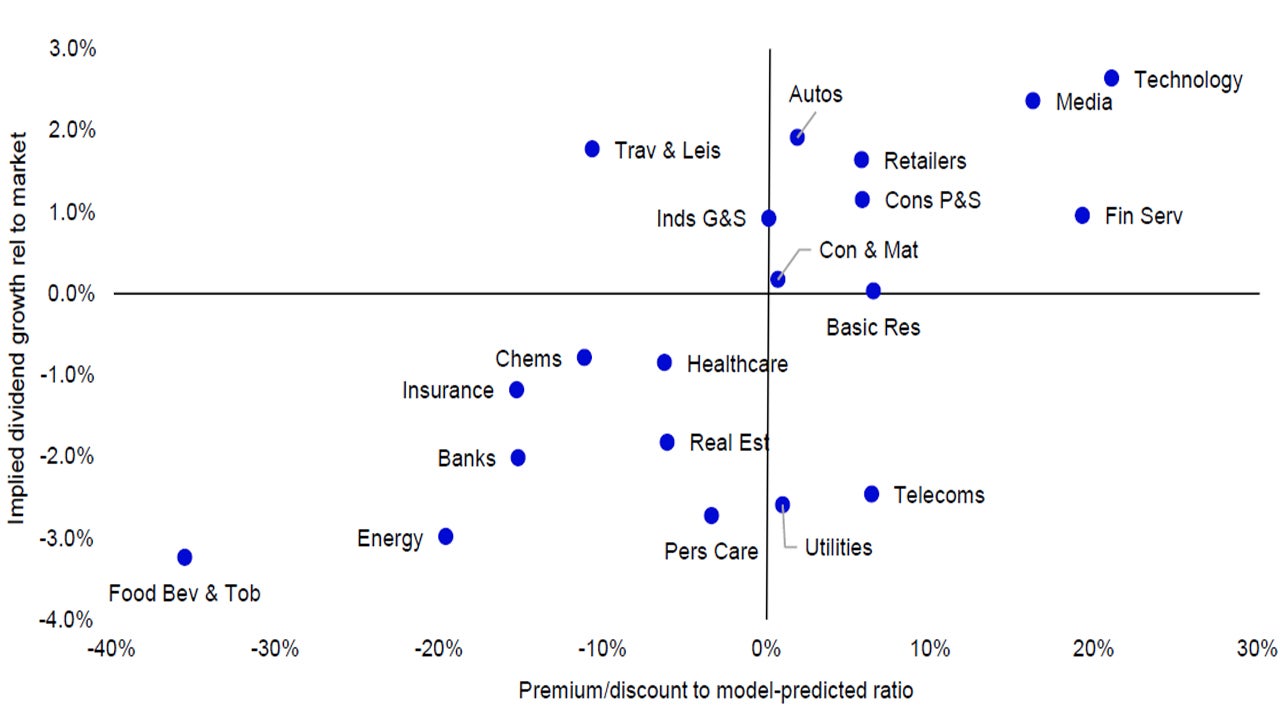 Notes: Data as of 31 March 2025. On the horizontal axis, we show how far a sector’s valuation is above/below that implied by our multiple regression model (dividend yield relative to market). The vertical axis shows the perpetual real growth in dividends required to justify current prices relative to that implied for the market. We consider the sectors in the top right quadrant expensive on both measures, and those in the bottom left are considered cheap. See appendices for methodology and disclaimers.