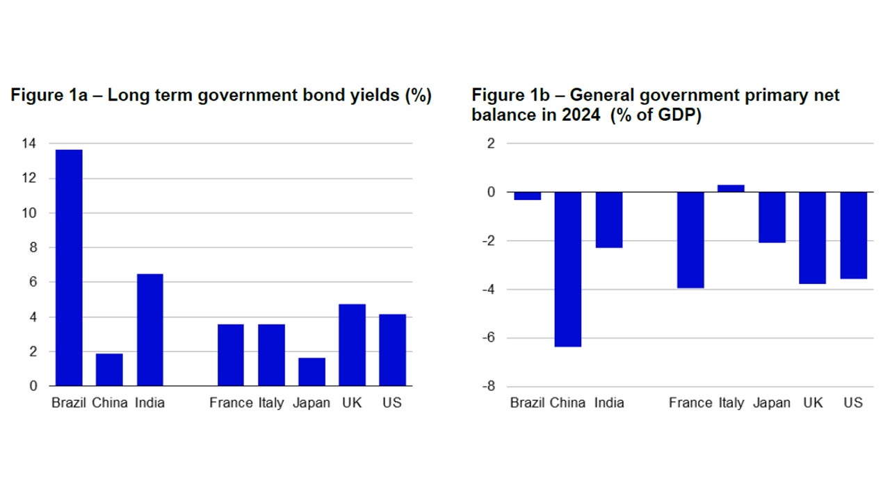 Note: Past performance is no guarantee of future results. Left chart shows 10-year government bond yields as of 26 September 2025 (from Bloomberg). Right chart shows the primary net balance, which is the budget balance excluding interest costs, as estimated by the IMF (or OECD for the US).