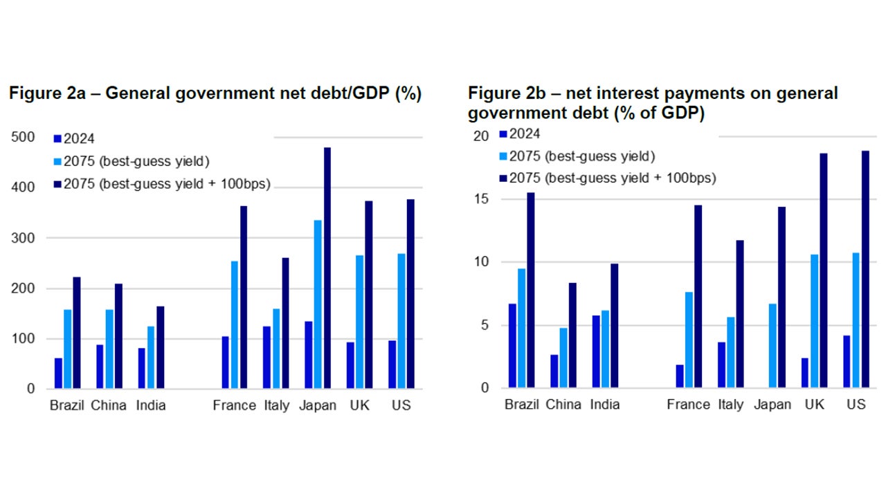 The first point of note is that the developed economies shown in Figure 2a had higher debt-to-GDP ratios in 2024 than the chosen emerging economies. My forecasts suggest that will still be the case in 2075 (see “best guess yield” forecast). Among developed countries, Japan’s debt-to-GDP ratio is predicted to be 334% in 2075 (up from 135% in 2024). The 2075 projection for France is 254% and that for the US is 268% (or 198% in 2054, versus the CBO estimate of 214% for that year). The forecast for the UK in 2075 is 265%, close to the OBR estimate that it will be above 270%.