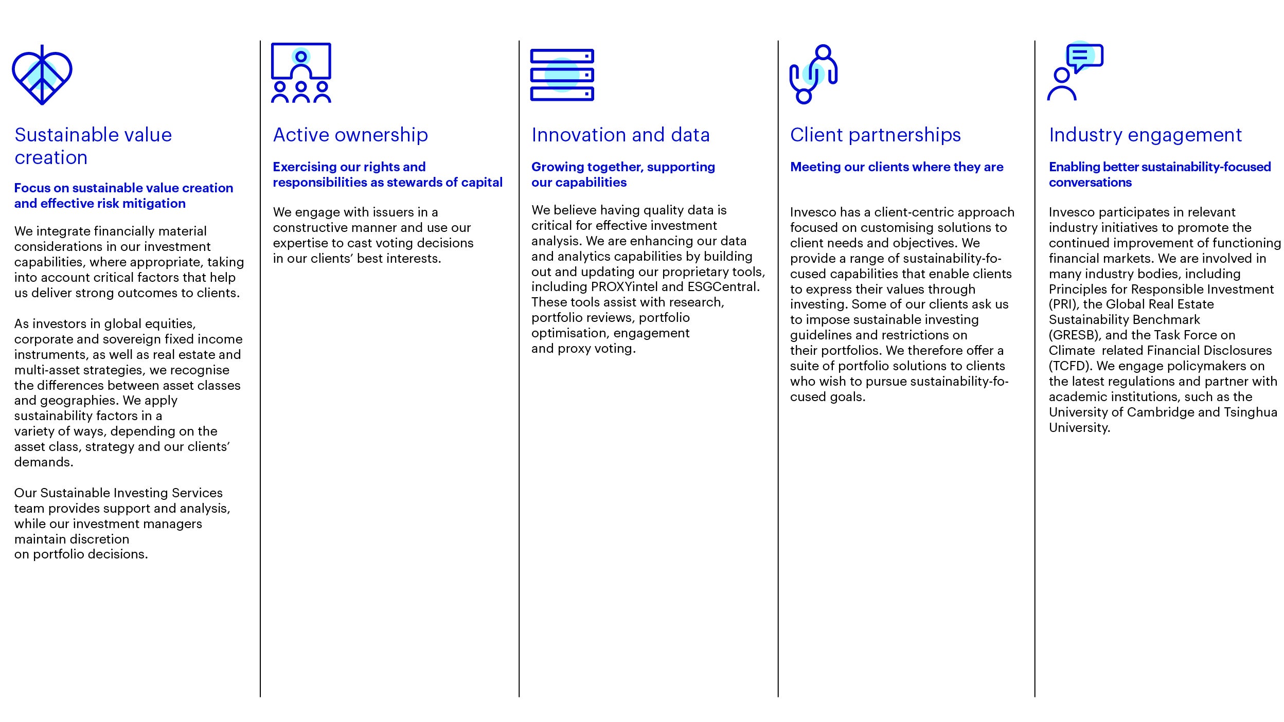At Invesco, our ambition in sustainable investing is to be the preferred partner for our clients. For many of our clients, long-term value creation and effective risk mitigation are fundamental to achieving their investment goals. As a result, we offer a range of sustainable investment solutions that help our clients to express their priorities across active, passive, equity, fixed income, real estate, multi-factor, and other exposures. We also adapt our offering to meet specific client needs, using bespoke solutions, such as self-indexing, to deliver the right investment outcomes.