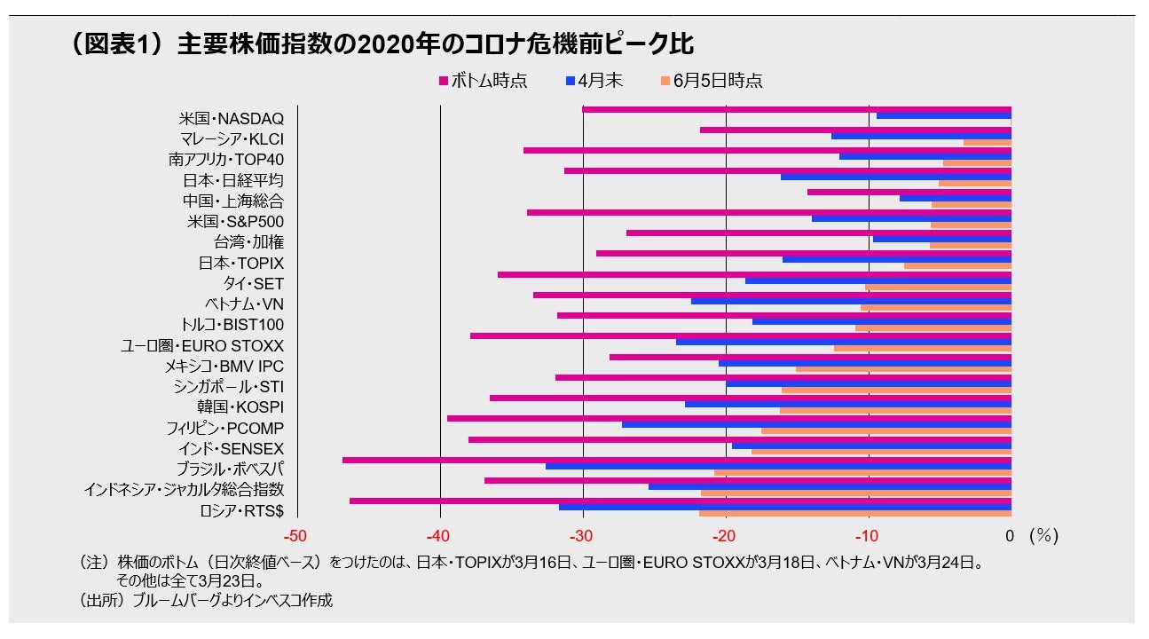 第3に、多くの国々において、株価がボトムをつけた3月下旬以降に株価の上昇が継続してきたことで、投資家が相場の先行きについて徐々に自信を取り戻してきたことが挙げられます。この結果、投資家はリスク資産に対する選好を強め、直近では先進国株式・債券市場だけではなく、新興国市場への資金流入も増加している模様です。国による差はあるものの、新興国市場での株価上昇がここ数週間で目立ってきました(図表1)。
