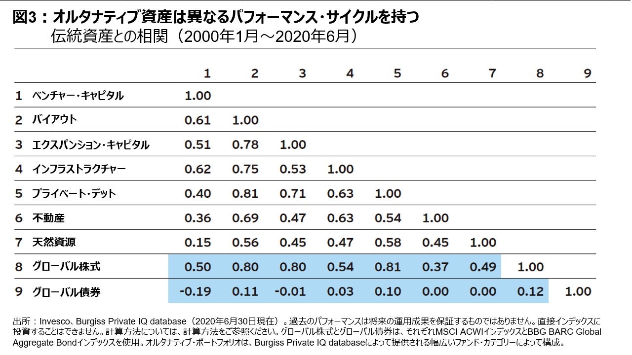 多くの機関投資家は、オルタナティブ資産をポートフォリオの中の独立した資産クラスとして捉えている一方、弊社ではオルタナティブ資産には、独自のリスクとリターンの源泉を有する様々なタイプの資産が含まれていると考えています。さらに、オルタナティブ資産は他の資産クラスとの相関が低いかもしれませんが、オルタナティブ資産の個々のサブクラスのリスク・リターン特性は、程度の差はありますが、上場株式や債券などの伝統資産と相関が高くなっています。例えば、プライベート・エクイティは株式と高い相関関係を持つことがあります。